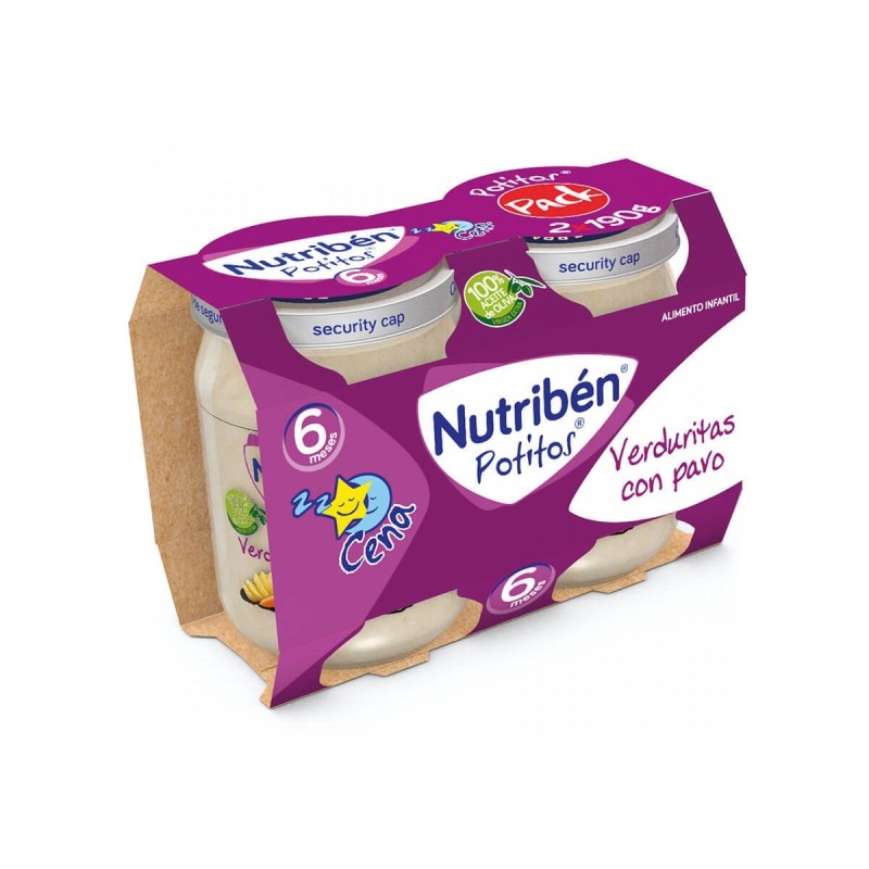Información del producto / Regulación Nutribén Potitos ® Cena de verduritas con pavo. Es un alimento infantil destinado a niños a partir del 6º mes de edad. Fabricado por Alter Farmacia S. A., Mateo Inurria, 30, 28036 Madrid (España). Nutribén Potitos® Cena de verduritas con pavo. Cumple con los estándares de composición establecidos por la FAO (ONU) en el Codex Alimentarius para preparados alimenticios complementarios para lactantes de más edad y niños pequeños, y es producido con los ingredientes y nutrientes abajo indicados. El producto sigue las recomendaciones de la ESPGHAN (Sociedad Europea de Gastroenterología Hepatología y Nutrición Pediátrica) y cumple con el Reglamento 609/2013 relativo a los alimentos destinados a lactantes y niños de corta edad, los alimentos para usos médicos especiales y los sustitutivos de la dieta completa para el control de peso. Nutribén Potitos® Cena de verduritas con pavo. Cumple toda la legislación europea relativa a pesticidas, residuos, sustancias tóxicas y perjudiciales. Listado de ingredientes en orden decreciente Agua de cocción Patatas 23% Leche adaptada 22% (leche desnatada y proteínas de leche) Pavo 10% Zanahorias 5% Arroz 4% Almidón de maíz Aceite de oliva virgen extra 0,7 % Cebolla.